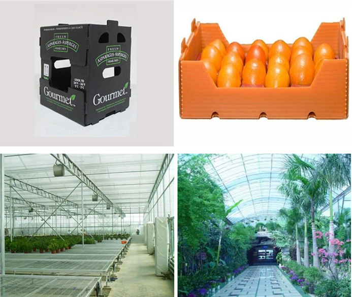 Полые листы из полипропилена в основном используются для упаковки экспортируемых овощей, продуктов питания, пестицидов, товаров легкой промышленности, скобяных изделий, строительных материалов, они также используются для оснащения бытовой техники, внутренней и наружной рекламы и украшения, украшения крупномасштабные выставки, сырье для товарных ящиков, основания для ваз и верхние крышки для автомобилей и т. д.
